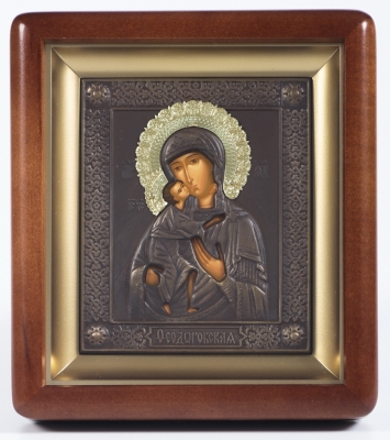 Икона в киоте 11х13 фигурный, темпера, риза патинированая Феодоровская БМ