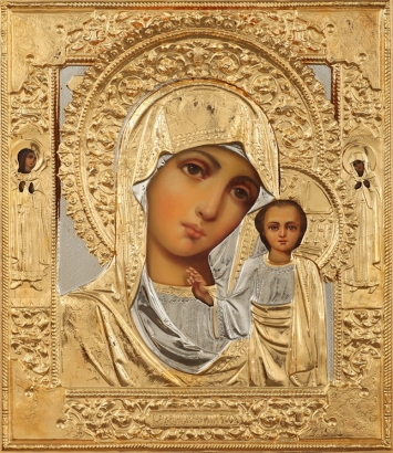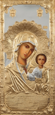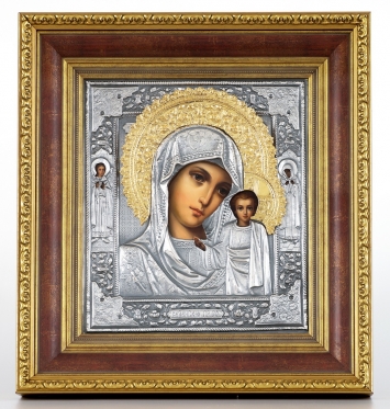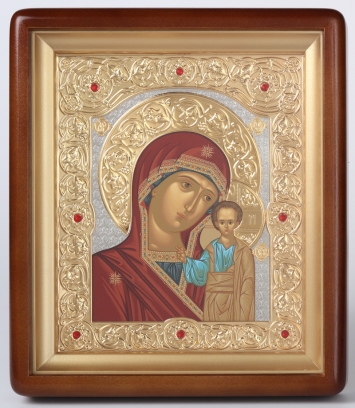 Икона в киоте 18х24 фигурный, темпера, риза объемная, зол., никелир., без цаты Казанская БМ