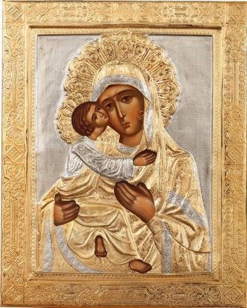 Икона в киоте 18х24 фигурный №4 темпера, риза объёмная, никель, золочение Владимирская БМ