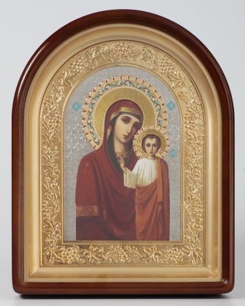 Икона в киоте 24х30 сложный, арочный, фото, риза объемная, открытая, золочение, эмаль Казанская БМ