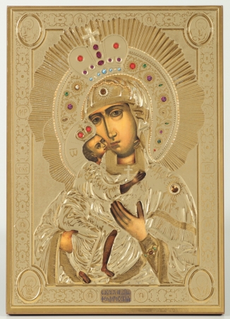 Икона в киоте 15х19 сложный, темпера, риза объёмная, никель, золочение Владимирская БМ