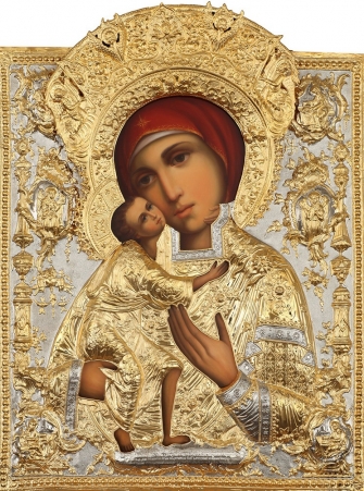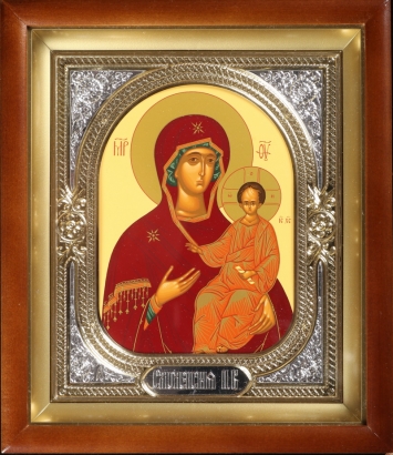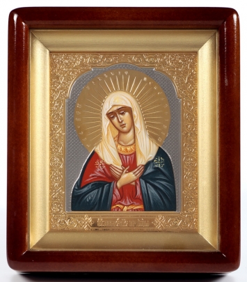 Икона в киоте 18х24 фигурный, темпера, риза-рамка объемная, открытая, золочёная, никелирование Умиление 1
