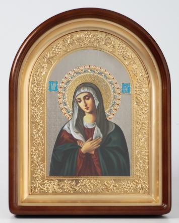 Икона в киоте 24х30 сложный, арочный, фото, риза объемная, открытая, золочение, эмаль Умиление БМ
