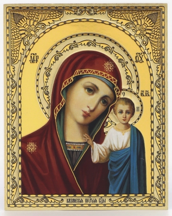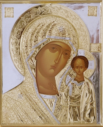 Икона в киоте 18х24 фигурный, темпера №8, риза-рамка объемная, открытая, золочёная, никелирование Казанская БМ