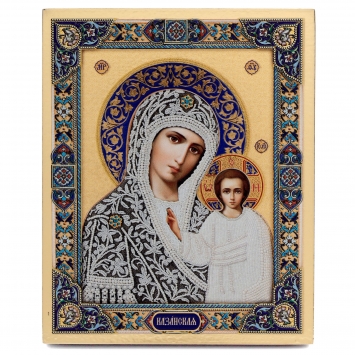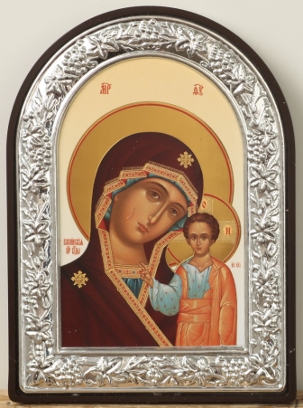 Икона живописная в гальванопластической ризе 40*50 серебро / киот / Казанская БМ (УИН)