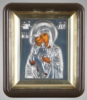 Икона в пластмассовой рамке 6х7 латунированная риза Владимирская БМ