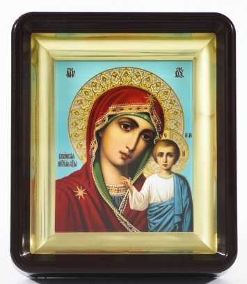 Икона в пластмассовой рамке Киот 11х13 латун. подрамник Казанская БМ 1