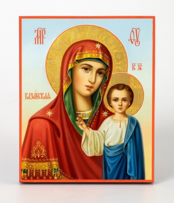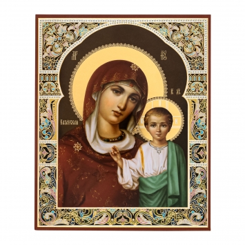 Икона на доске 13х15 золоченое покрытие, объёмная печать, лак Казанская БМ с молитвой