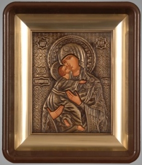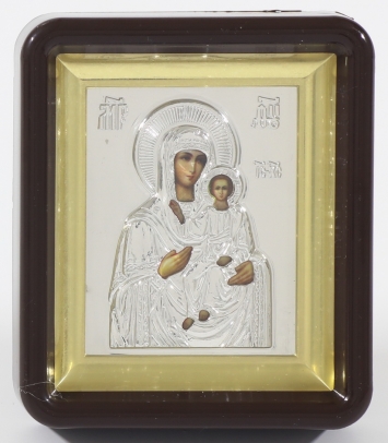 Икона в пластмассовой рамке Киот 11х13 латун. подрамник риза патинированная Владимирская БМ