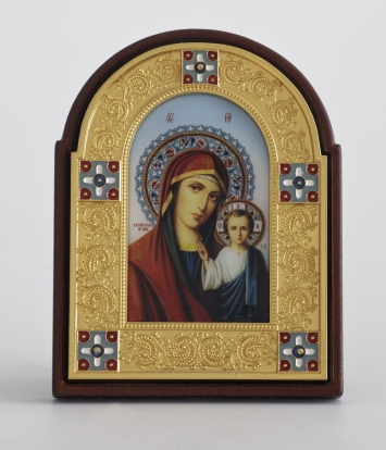 Икона именная №41 печать эмалированная, гальванопластика, эмаль в деревянной рамке / золочение, электрофорез / Казанская БМ