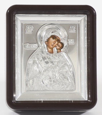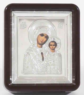 Икона штампованная 6*7 / темпера / золочение / серебро в металлическом киоте Казанская БМ (УИН)