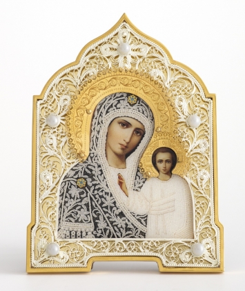 Икона именная №45 печать эмалированная, филигрань в деревянной рамке / золочение, серебрение / Казанская БМ