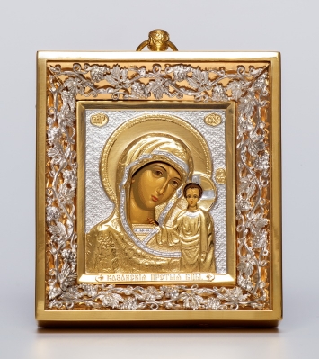 Икона штампованная 6*7 / темпера / золочение / серебро в металлическом киоте №2 Казанская БМ (УИН)