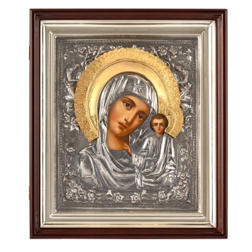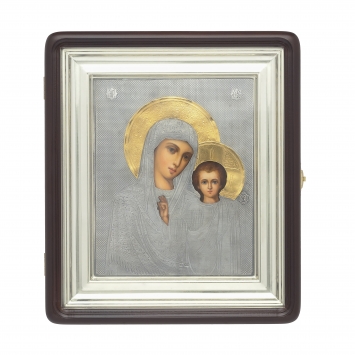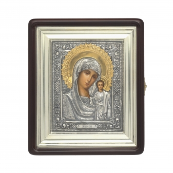 Икона настольная №156 гальванопластика, эмаль, деколь, в деревянной рамке / серебрение / Казанская БМ