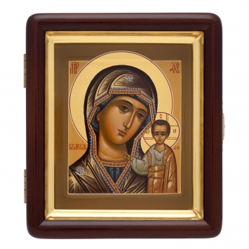 Икона живописная на доске в киоте 11х13 темпера, золоченый нимб, ковчег, киот №1 Казанская БМ, 02599