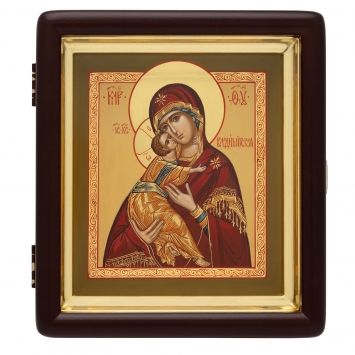 Икона живописная на доске в киоте 13х15 темпера, золоченый нимб, ковчег, киот №1 Владимирская БМ, 02603