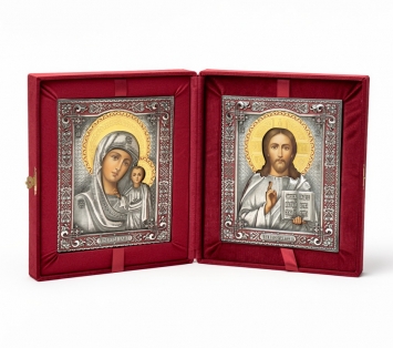 Складни живописные в футляре 18х24 масло, ризы №241, №242 черненое серебрение, эмаль (бархат) Спаситель-Казанская БМ