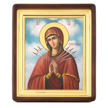 Икона живописная на доске в киоте 24х30 масло, золоченый нимб, киот №1 Семистрельная БМ, 04598