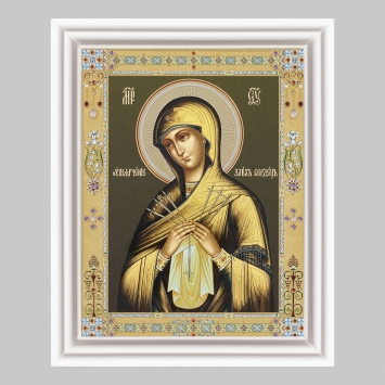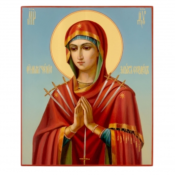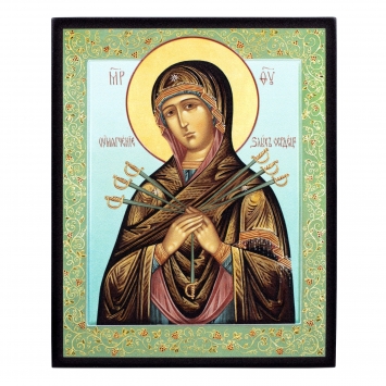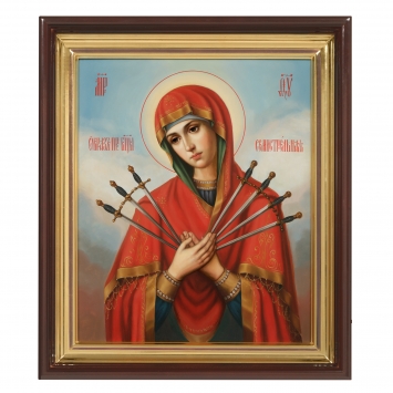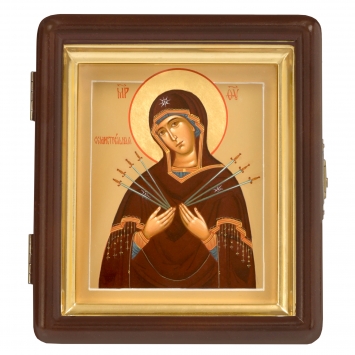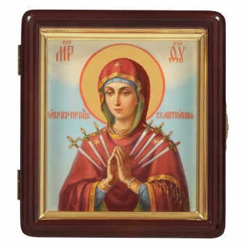 Икона живописная на доске в киоте 13х15 масло, золоченый нимб, киот №1 Семистрельная БМ, 04860