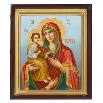 Икона живописная на доске в киоте 30х40 масло, золоченый нимб, киот №1 Троеручица, 05516