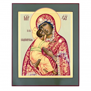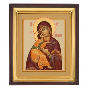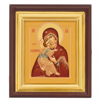 Икона живописная на доске в киоте 30х40 темпера, золоченый нимб, ковчег, киот №1 Владимирская БМ, 05172