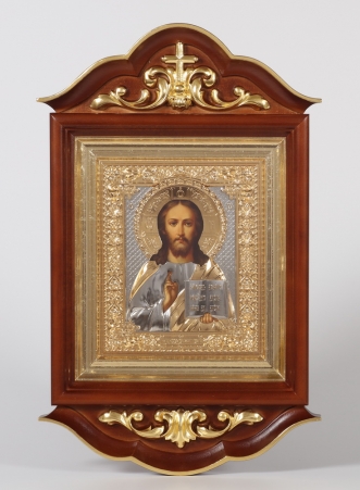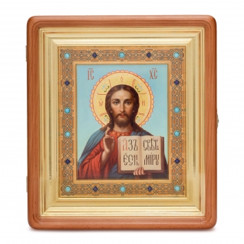 Икона в киоте 24х30 фигурный, темпера, риза объемная, открытая, золочение, эмаль Спаситель