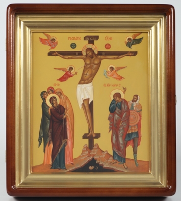 Икона живописная на доске в киоте 24х30 масло, золоченый нимб, киот №1 Распятие