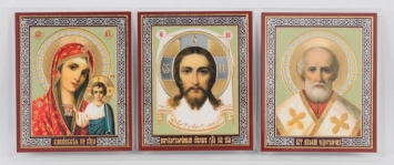 Икона в пластмассовой рамке 4,5х12 тройная с подставкой Казанская - Спаситель - Николай Чудотворец