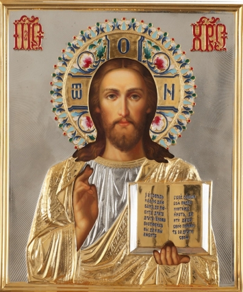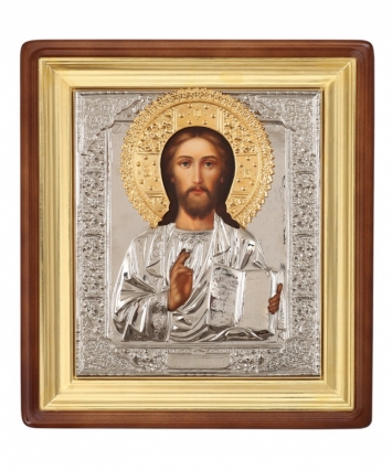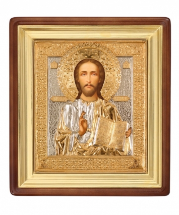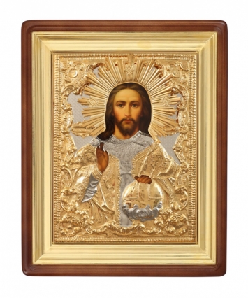 Икона в киоте 18х24 фигурный, темпера №8, риза-рамка объемная, открытая, золочёная, никелирование Спаситель