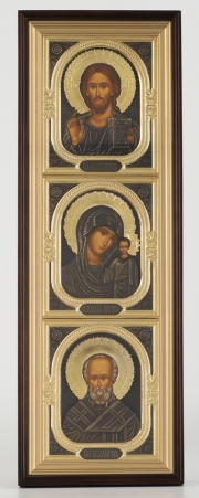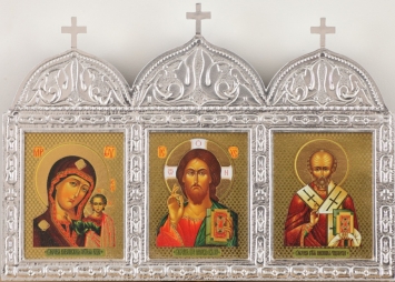 Икона в жесткой ламинации складень-тройник 7х18 двойное тиснение Спаситель-Казанская БМ-Н.Чудотворец 31