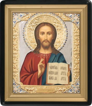 Икона живописная в киоте 24х30 масло, риза №96, черненое серебрение, киот №22 Спаситель