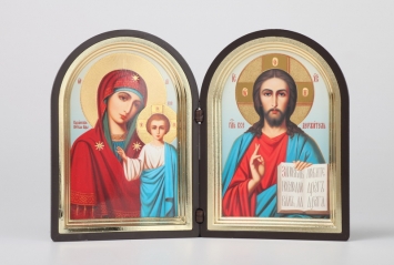 Икона в пластмассовой рамке Складень 9х12 двойной арочный рамка латунированная Спаситель-Казанская БМ