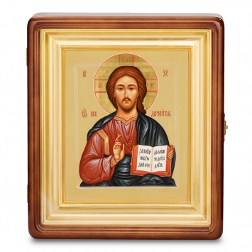 Икона живописная на доске в киоте 24х30 золоченый нимб, киот №9 Спаситель