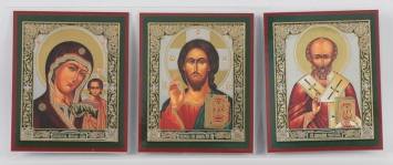 Икона в жесткой ламинации складень-тройник 7х18 двойное тиснение Спаситель-Казанская БМ-Н.Чудотворец 10