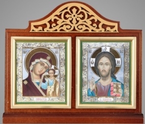 Икона настольная 6х7 двойная, двойное тиснение, золоченая рамка Спаситель-Казанская БМ 10