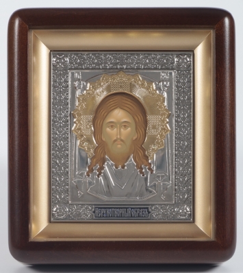 Икона в киоте 18х24 фигурный, темпера, риза объёмная, закрытая, частично золочёная Спаситель