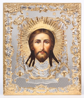 Икона в киоте 18х24 фигурный с навершием, темпера, риза объемная, частично золочёная Спаситель Вы используете устаревший браузер, который создает угрозу безопасности использования сайта.