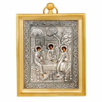 Икона настольная №140 серебро деколь, филигрань.роспись.гильяш / золочение / Троица (Рублевская) (УИН)