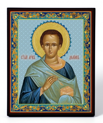 Икона в жесткой ламинации 8х11 с оборотом, двойное тиснение, высечка Пантелеимон (ростовой)