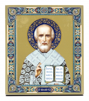 Икона на доске 13х15 золоченое покрытие, объёмная печать, лак Николай Чудотворец 5 (жемчуг)