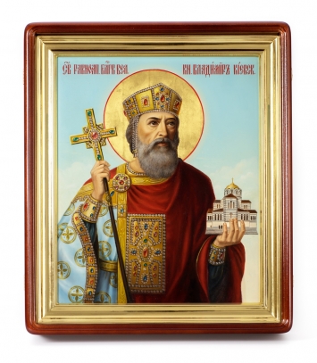 Икона живописная на доске в киоте 30х40 масло, золоченый нимб, киот №1 Владимир Равноапостольный