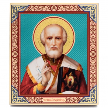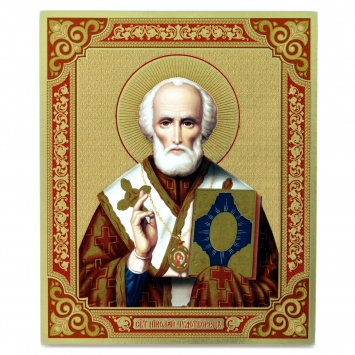 Икона на доске 18х24 золоченое покрытие, объёмная печать, лак Николай Чудотворец 3 (с красной рамкой)