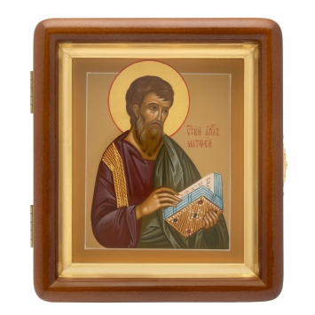 Икона живописная на доске в киоте 11х13 темпера, золоченый нимб, ковчег, киот №1 Апостол Матфей, 03919
