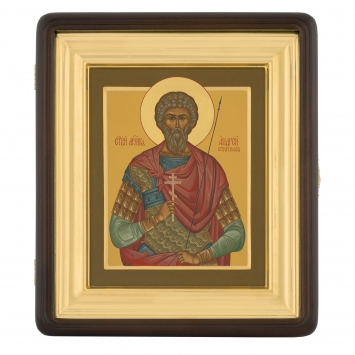 Икона живописная на доске в киоте 18х24 темпера, золоченый нимб, ковчег, киот №1 Андрей Стратилат, 01214