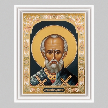 Икона в деревянной рамке №3 11х13 (белая) двойное тиснение Николай Чудотворец 19