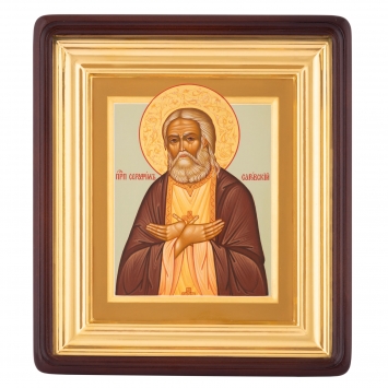 Икона живописная на доске в киоте 18х24 темпера, золоченый нимб, ковчег, киот №1 Серафим Саровский, 04629