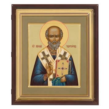 Икона живописная на доске в киоте 30х40 темпера, золоченый нимб, ковчег, киот №1 Николай Чудотворец, 05006