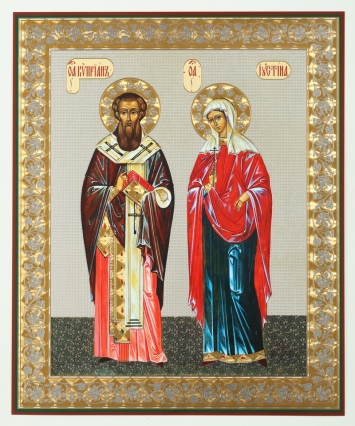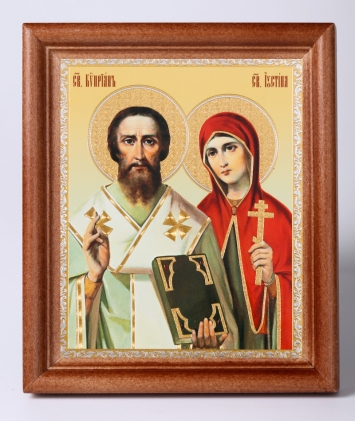 Икона в жесткой ламинации 8х11 с оборотом, двойное тиснение, высечка Киприан и Иустина