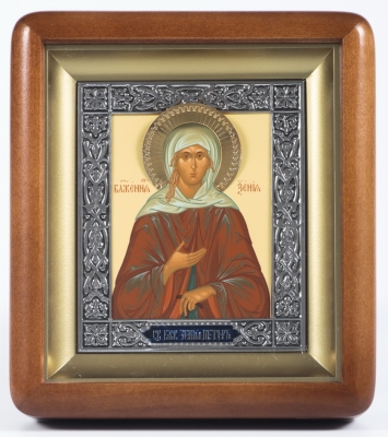 Икона в киоте 11х13 фигурный, темпера, риза, никель, эмаль Ксения Петербургская