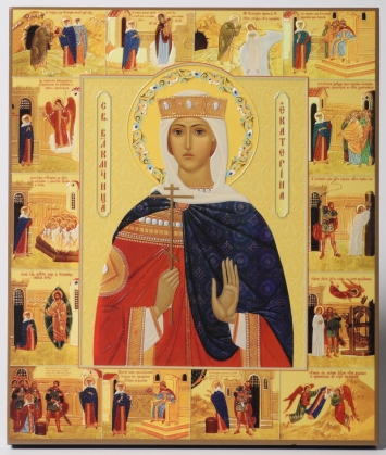 Икона на доске 22х26 объёмная печать, лак Екатерина с житием